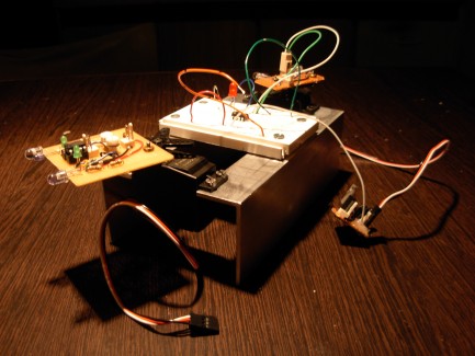 As of right now, as you can see in the picture, there is no locomotion involved. The chassis houses the electronic guts. I have 2 servos mounted on each end. One operates the IR-proximity-sensor-turret and the other operates the motion tracker. Each of them has a Picaxe 08M for brains.