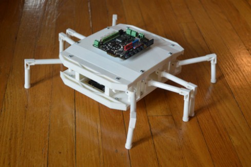 This is my latest robot named Octobot. It was designed entirely with CAD (Solidworks). Most of the parts were 3D printed. The 8 legged spider robot is controlled by a smartphone using Bluetooth LE. The control board is the Romeo BLE bluetooth and motor controller board from DF Robot. The robot uses only 2 geared DC motors. Each motor drives a set of 4 legs on each side. Will be adding some other sensors and using this robot to experiment with spider AI.