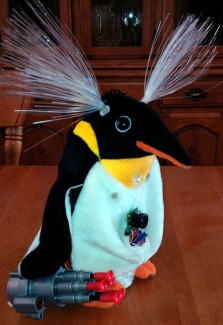 I started with (very noisy) Penguin toy that has not worked in a year or so. We left the batteries in it, and they leaked all over the inside, corroding the leads to the motor... Hmmm... fix it as is? Or make it AWESOME!!!