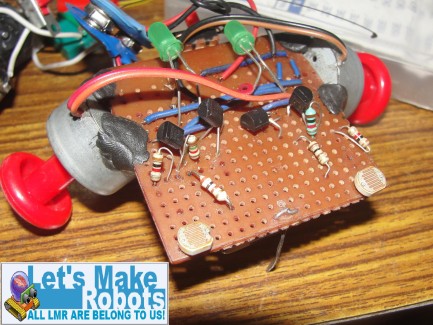 This is a light sensitive robot. It follows light. It can even do a wheelie. It detects the light by its eyes(LDRs). Pretty simple circuit consisting of four transistors. The circuit can be divided into 2 independent symmetrical parts. The right motor rotates when the left LDR detects light. The left motor rotates when the right LDR detects light. When both LDRs detect light, Both motor rotates and the bot goes forward. I got the basic circuit diagram from the e-book '1-100 Transistor Circuits'.