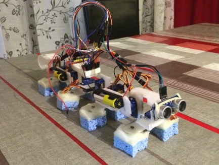 This one was on the pipeline for a long time and I've been building it for some time now. It´s my small tribute to Oddbot's Polimorph Caterpillar. Loved the mechanics of it and I'm still struggling with it. Lets see if I can make it walk, as for now it only twitches in the same place. Perhaps it's from the legs, couldn't find anything appropriate to use so I improvised with some bathroom foam :) but it is hard to shape so i t could be holding it back... I don't Know... It uses 8 micro servos, 1 Arduino nano from China :), 1 HC-SR04, 4x1,5V batteries and it will use one 9V for the Arduino (for now it is USB powered) and lots of Polymorph that took forever to shape... :) I hope I'll post another video as soon as I can make it run forward...