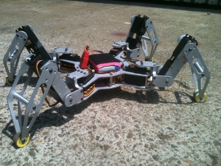 This quad is built from 2mm aluminium plate cut on my homebuilt cnc, its using the freetronics eleven microcontroller and 12 hitec hightorque servos, at the moment for testing its powered with a 5 cell 2000mah 6v pack hopfully in the future when it is fully autonomous it will be powered with a 2 cell lipo, and light seeking to charge itself.