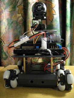 This is the fusion of my old Qwerkbot project and a 4WD base, with omniwheels replacing the originals. I've also attached one of Oddbot's compound IR sensors for better object tracking.