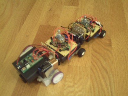 Red Leader is preprogrammed to go to a set location and lead the group to that location. Red Leader uses a simple PICAXE 08M2 with a very simple motor driving circuit that uses the 2907A transistor. Red Leader also has an IR beacon on its back that has a total of 10 IR LED's so that Red 1 is able to track it. All in all, a fairly rudimentary digital robot.
