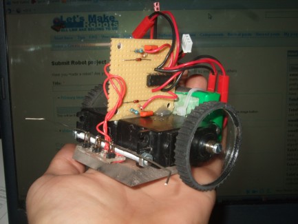 This is a "one day" project- simple robot with two whiskers, who can avoid obstacles. This one is built around motor driver IC L293D, and some transistors and capacitors. Wheels are custom made (laser cutted) with a rubber glued on it. Also two modified TowerPro MG995 servos with removed electronics. Construction is as simple as it can be. Most parts are glued with hot melted glue.