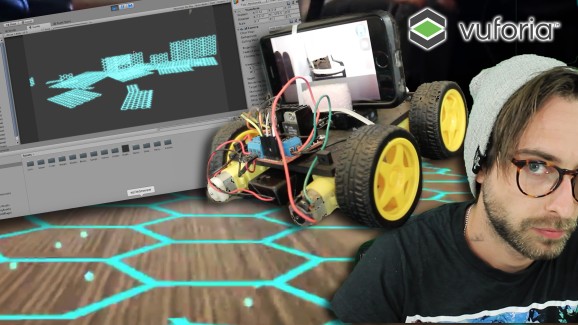 This project uses an Arduino robot running a ESP-8266 Node MCU that communicates (and drives around) with a mobile phone. The phone is running an app made in the video game engine Unity 3D that does 3 things: