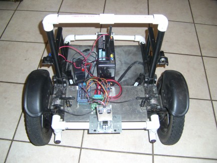 I had to add the top PVC bar to make it stable since the front and rear bars are not yet permanently attached. I plan on taking an inch off the back to move it in more so I can run the plate bolts through the PVC (the metal plate sags with the battery which is why it's sitting vertical and moved forward).