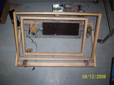 This is a solar tracker that I'm working on. It's a stationary robot that will keep a pair of solar panels perpendicular with the sun so that they can charge batteries. I only have one panel on it, but in the end, there will be two. By the time I was able to test it, it was already dark so I walked around with a high powered halogen lamp in order to simulate the sun and have the robot track me. I still have a bit of testing to do, but for the most part, it works.