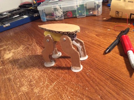 5/5/17: I have replaced Strider's twine walking mechanism with paperclips. He still falls over a lot, and he skitters instead of strides (due to using a 9v battery with a high-speed motor- again, I don't have a proper 6v battery yet...). But nonetheless, he can get around! However, I am open to any suggestions/tutorials to make him even sturdier, less fall-prone, and walk more than skitter (though I'm aware that the last one has a lot to do with the voltage and high speed of the motor)!
