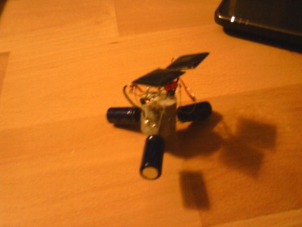 Hi guys! I am working on the Symet project from "Junkbots, Bugbots, and Bots on Wheels". He's my first attempt at BEAM robotics, and the first robot I've actually built from scratch (my only other bot is a BoeBot, and of course Lego Mindstorms). It uses an FLED solar-engine, which stores up energy in it's three 4700 uF capacitors lining the sides. Every second, the FLED tries to blink, and if there is enough voltage in the capacitors (around 2.3 volts) electricity passes through the FLED, triggering a PNP transistor which in turn triggers a NPN transistor which lets power go through to the motors. If that was too much for you to comprehend at once, here's the schematic: