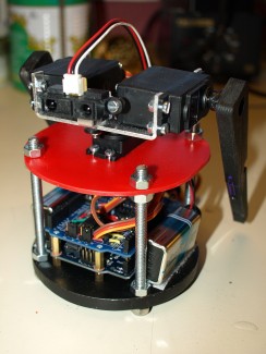 The base is an 8mm aluminum plate to give it some weight and stability. The Arduino is mounted on spacers on the base plate. An Arduino protoshield holds the voltage regulator for the servo power supply and headers for the servos and Sharp GP2D12 sensor.