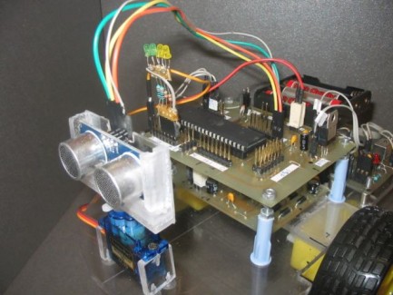 The robot shown here, which is based on factory parts. The HC-SR04 ultrasonic sensing type distance measuring device used. The sensing distance of 10-20 cm. The robot should turn around and go back up in this. The rotation sensor is carried out by a small servo motor, with the SG90's.