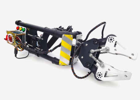On the electronics side, an Arduino Uno is what controls everything. In it are connected the servo motors (with a sensor shield to facilitate connections), a joystick, three buttons and a NeoPixel ring. The joystick controls wrist rotation and grip opening. The buttons are used to choose the operating mode. And the NeoPixel ring displays the color of the chosen mode.