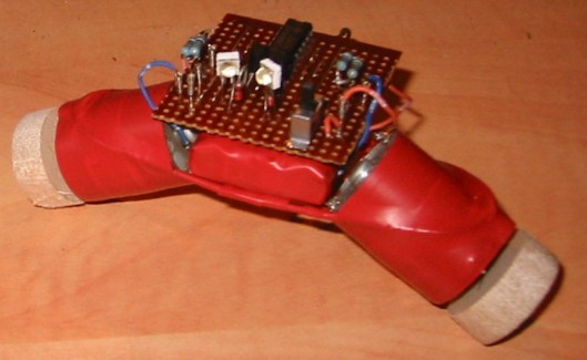 The robot consists of: two photodiodes (pulled from a VCR), a 7404 IC (Hex Inverter), two transistors (BC548), two diodes (scavenged from some PCB or another) and a Ni-MH battery pack from an old mobile phone. The chassis was made by soldering copper wire to the motors and provides a simple, flexible base for the bot. Two wheels made from balsa wood finish the robot. As all the parts were scavenged or found (exception of the transistors which were bought in a set) the build didn't cost anything, which was a key factor in the design as I didn't have any money for buying parts when I made this back in 2004 (poor student and all that).