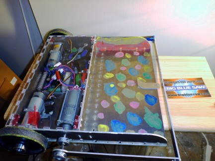This is my new 12-pound class fighting robot for this year's Robot Battles at Dragon*Con. It features a scoop and a lifter/clamper that rotates 360 degrees around the robot's body. The aluminum body and polycarbonate top were waterjet cut by Big Blue Saw.
