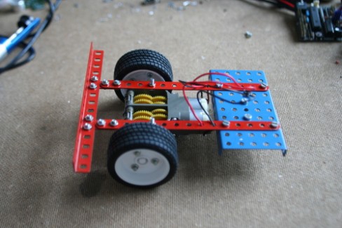 This is my first robot. It can't do much now, but drive ahaead, since there are no sensors on it yet.