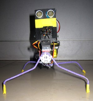 Last news: I attached a buzzer and two white LED's and programmed some subroutines for it. The buzzer will beep several times when detecting an obstacle and the LED's will light up in the way he is walking. straight forward both LED's, backward right the right one, left forward the left one...This i just did to get some ideas about the programming and wanted to try the other components ;-)