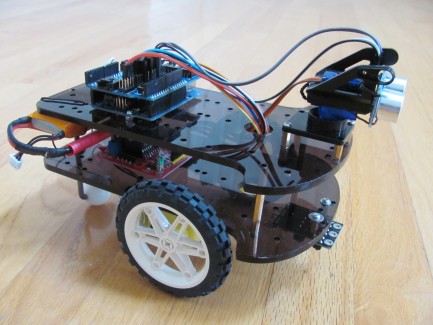 Started this project from a Hobby King kit with no manual. Put the parts together and wrote an obstacle avoidance program. The original design provide no differentials so the four wheels have to fight with each other most of the time. The two rear wheels were removed and replaced with a caster ball. Since then the operation has been smooth.
