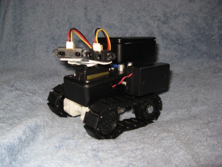 Right now I am just running some super simple code just to get it moving around. I have used the "crossfire" arrangement of the IR sensors on a couple other projects and it seemed to work well. I have never used this placement on top of a servo before though. As of yet the servo is hooked up but not coded to do anything. Eventually I will be interested to see what I can do with a little head sweep- To each side one sensor will be looking directly forward (while being left or right of center) and the other aiming directly to the side. It will be neat to see just how narrow an opening it will be able to fit itself through. --That is if I can stuff that many lines of code in this little picaxe 14M.