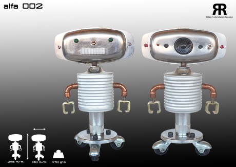 Unit assembled in July 2018. The elements that make up its morphology are: heat sink, green LEDs, infrared sensor with motion detector, sound module, speaker, electronic components, tin can, snack trays, flashlight holder, movable wheels. plumbing components, electrical cables and connectors. Its luminous functionality is provided by the two green LED eyes that, powered by a 1.5-volt lithium battery, light up when a circuit controlled by an infrared sensor is activated. Its sound functionality is provided by a recording and reproduction module housed inside, powered by two 1.5-volt batteries and activated by the buttons that are housed on the back of the unit.
