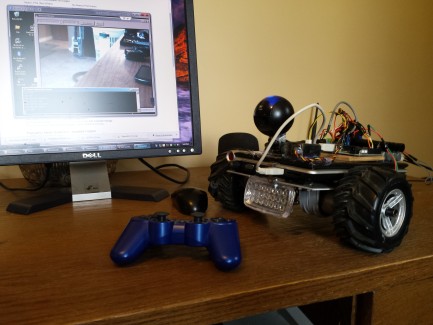 This is a robot I built out of stuff I had laying around. All the software to control the robot is on the netbook. To use the robot you login with a remote desktop application like Teamviewer or Vnc. Once the netbook is connected and all the software is setup we program the arduino to accept keyboard commands on the serial port. Then use the joytokey application to send the PS3 joystick commands over the serial port using putty. The video feed is handled by a free webcam viewing app.