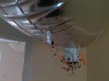 The original plan was to build two battle blimps that used sonic to ovoid objects and infra- red to find each other, a direct hit from the nose would count as a hit and if the blimp hit anything else on any other part of its body it would be a crash. Sadly when the balloon turned up it was obvious that i wasnt going to two in the same room and having just moved house and being near xmas i was short of money, so the blimp became an autonomous bot and all but two sensors were changed to sharp ir and i removed one that looked down in front of it and changed the code to make the bot drop and use its front ir to see if it can fly under an obstruction. I only have 1 short vid and the bots sensors were not set up so it just kept flying into the wall and the blimp has sprung a leak now and because its to big for my house i wont bother fixing it, it was going to have a short life any way, it needs to be topped up every couple of days just to keep it floating but for anyone else who wants to build one dont use ir stick with sonic sensors the bot moves fast and the range on the ir sensors is too short even when pulsing the motors to slow it down it will still hit walls. if you order this balloon your balloon can lift close to 200g but you will be close to springing a leak, i put less gas in mine and it had neutral bouency lifting 140g of which 25g was ballast. http://www.rctoys.com/rc-toys-and-parts/MACH-ZENV-SILVER/RC-PARTS-BLIMP-HELIUM-BALLOON-ENVELOPE.html for the small motors and battery's this place is by far the best and cheapest http://www.atomicworkshop.co.uk/catalog/
