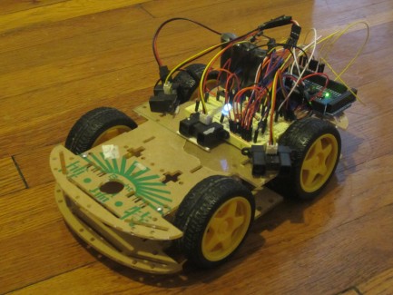 The car chassis was purchased from e-bay. It uses 3 IR sensors to avoid walls. There's a button to turn the car on and off, and a potentiometer to set the car's top speed. An RGB LED displays the car's current behavior: green for wander, blinking red for escape, and blue for "random turn".