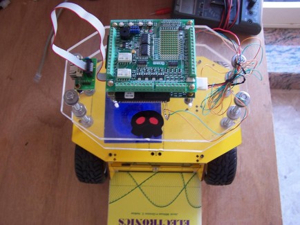 Three SRF10 sensors are used to detect obstacles in a range in excess of 180 degrees. The Viper-LITE and Viper-I/O boards are mounted on the topmost panel, since the switches on the Viper-I/O are used to administer the robot, and the CompactFLASH must be easily accessible as it is used to store the robot configuration files.