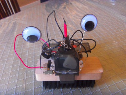 Here he is, after three hours of soldering. His brain is the exact one from the "Junkbots, Bugbots, and Bots on Wheels" book. He's still a work in progress, and I still want to add some indicator LEDs and some solar cells so he can charge a battery. Also, I'm really new to this stuff, and I would appreciate any tips and/or constructive criticism and/or ideas. His body was from a kit called a brush bot that I modded a little with a dremel tool.