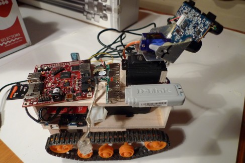 The two microcontrollers will be connected by USB, along with a USB webcam mounted on a servo pan/tilt mechanism, and a USB wifi dongle for internet connectivity. Basic tank treads will provide movement, possible being replaced by servo-based legs for a humanoid or dog form.