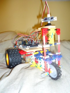 Like the first one, the structure is made with knex and the controller is an arduino uno. This time it uses an infrared sensor moved with a micro servo to check distances, and the 2 back wheels are powered wih separated DC motors. The 2 DC motors are controled via a module (bought all mounted) using a double H-bridge (L298), which allows changing direction and speed of the 2 motors separately.
