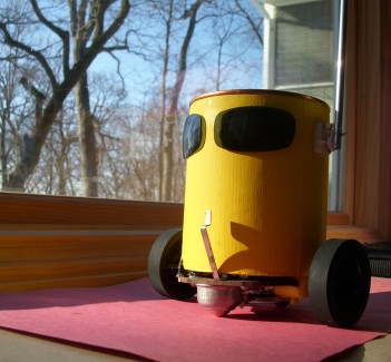 This simple robot handles basic navigation and is armed with a bass drumstick thumper at the rear and a high hat drumstick on his left side. His front bumper switch is used for collision detection. He currently has three drumbeats he alternates between.