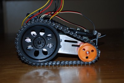 This robot is based on the Parallax BoeBot. The chasis is flipped upside down. The tracks the Tamiya Track kit. It uses the BoeBot IR sensors and a Sharp IR sensor has been added.