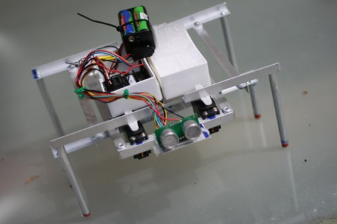 Based on 2 photos of "stomper". I went to my local hardware shop and bought a 2M length of 10mm angle ali and a 1M length of 8mm round ali and some nuts and bolts. 5 Hours later with another trip to get some more nuts and bolts, the hardware was finished. I had a couple of servos lying around and have been getting into PICAXE programming so I had a couple of AXE020 boards also. I pinched a servo and the ultrasonic sensor from my eldest, who is doing a computer science degree and had them for a project ( he wont notice ).