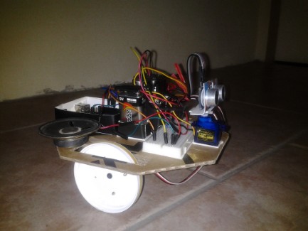 There is nothing very special about this robot he just navigates around without crashing into things (most of the time). His body is a fairly stiff cardboard cut into the shape of a regular octagon, the wheels are made of plastic jar covers with rubber bands to improve traction, each wheel is connected to the servo horn with screws, connections are made with jumper wires and a breadboard, the speaker was salvaged from an old electronic alarm clock and is connected in series with a 220 ohm resistor to reduce the current to a level that can be handled by the pin on the Arduino clone. Cardboard was used to make little boxes to hold the Arduino clone, and both the 9V and the 4 AA batteries. A bracket to hold the ultrasonic range finder was cut from a piece of a plastic ice cream container. It is all held together by double sided foam tape (thanks Chicken Parmi).