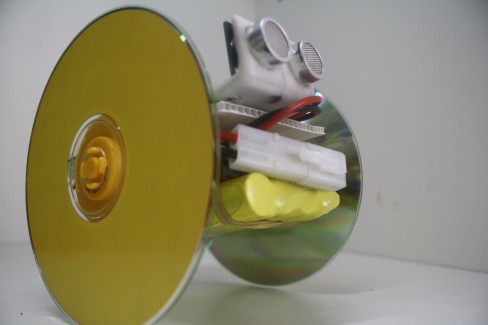 This is a very simple robot which only has two wheels made of old CDs. Its brain is a motoruino and uses a sonar to detect and avoid the obstacles. On the video you can watch him navigating around, using the battery wire as a support to keep the balance.