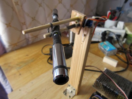 Notched the lower finger to trap the pen. Also on the pen are a couple pieces of tubing and rubber bands to trap them in place. This is necessary to keep the pen centered for long periods of time. For short periods of time they are not required.