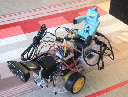 Hardware used:Raspberry Pi, Arduino UNO,Magician Robot Platform with two DC Motors, 2 Servos, USB Camera, PAN/TILT brackets, USB HUB (the little blue robot), USB battery (5V - 50000mAh), HC-SR04 sensor, 1Wifi Dongle, LD293D Chip, 4xAA case, 1 medium breadboard, 1 mini breadborad and lots of jump wires...