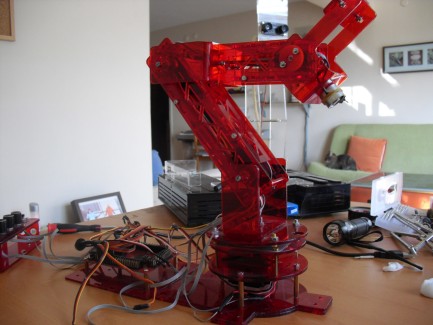 Thanks to the Arduino Mega based Spider board with lots of extra inputs I made a small remote control as well. The remote control positions get sent to my desktop Delphi program which then reads the position the arm joints are in and moves them accordingly.