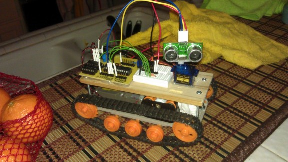 This is the "Chinese Bot". Its called that because 95% of the parts were sourced from China (via eBay). It uses Tamiya dual-motor gearbox, a cheap home-made arduino clone and has a 3-axis accelerometer.