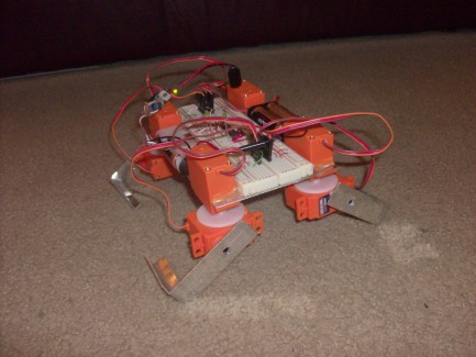 Clyde is a 8 servo quadroped walker, he was my first attempt at a robot before I had any sensors. Clyde is as basic as an 8 servo walker can get, one piece of aluminum for a baseplate, everything else hot glued to that. I wish I could post more pics, but the structure of LMR makes it a little tedious.