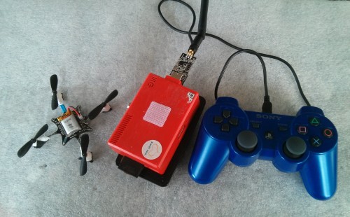 The CrazyFlie Nano-Quadrotor is a Micro-Quad/development platform. Everything from the PCB diagram to the PC-Client to the radio is based on open source components. While still very very early in development, the Bitcraze development team is a near-perfect example of open hardware best-practices in action. They have a well-organized product-wiki- http://wiki.bitcraze.se/ which is frequently updated with suggestions, hacks and mods culled from an active user-forum-http://forum.bitcraze.se/. The Crazyflie is operated from a "CrazyRadio" USB Dongle attached to a PC running the client software with native support for a PS3 Gamepad. Getting it up and running on Ubuntu was simple as can be, but it wasn't long before the PC started to get in the way. Enter the Raspberry Pi! Following these instructions for running the Headless PC-Client on the Raspberry Pi (http://wiki.bitcraze.se/projects:crazyflie:hacks:rasberrypi) I was able to get it up and running through the command line. After some difficulty getting the program to start automatically with SSH, I eventually found success following the autostart method outlined in this slideshare- http://www.slideshare.net/SeggySegaran/raspberry-pi-autostarting-a-python-program. Adding a USB Battery-Backup and an old Wii carrying-case, I now have myself a fully-portable RC base station for the open source quadrotor! All thats left to do is to find a workable microcamera to mount and the best is yet to come!
