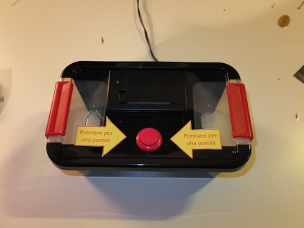 It’s made ​​with an Arduino using a printer for receipts to write poem. The box composes the poems in autonomy, thanks to an algorithm that has been implemented on the Arduino. Push the button and here your dadaist poem. Each poem is different from the previous. It is original, new. Just press a button, and comes out a poem. Simple, immediate, trivial. Normally, the poem is a valuable asset, is the result of an intimate moment, when the poet transposes on paper the emotions of his soul. It ‘an act inspired, an act of concentration and transport. It’s not immediate. The poem box instead is trivial, it seems almost anti-poem. But not, it’s Dadaist poem. In one of his writings, the famous poet Tristan Tzara, one of the major poets Dadaists, describes how to produce a Dadaist poem. The pass following explains their way to proceed: