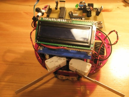 I have attached some images of my first robot. It is built around a pololu round chassis, tamiya twin motor gearbox, and tamiya off road wheels along with a ball caster (also made by tamiya). There is a second deck made from some blue HIPS, and it runs off of 4 AAs and a 9v battery. The "brains" are simply an atmega8 and an L293d along with supporting circuitry. I aim to make this into a sumo and line following robot, however I wanted baseline electronics, chassis and control code to start with. The control software is written in C along with avr studio and winavr, at the moment it has two modes - autonomous with input via two NO switches, and an I2C interface with a nunchuck for wired remote control. I had originally used a Bit bashed SPI interface with a Dualshock controller, however the extra buttons, code space and I/O pins required for this made switching to the Nunchuck an easy decision. The control algorithms and software structure for this project are very simple at the moment: