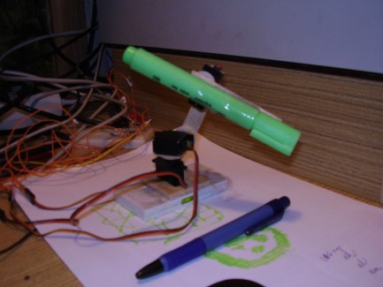 I think, it is one of the cheapest 3-axis robotic arms. It can move, kick and mainly draw in many ways. It is controlled throught PC, which sends command via serial link to Picaxe 08M. Picaxe sends pulses to servos and they move. I used Picaxe, because PC with Windows cannot send accurate pulses via serial port.