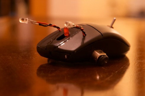 One surprising fact I learned while working on this robot is that, just like a motor will also function as a generator (and vice versa), and a speaker will function as a microphone (and vice versa), LED's also function as light sensors. Any plain old LED will produce a slight voltage across its pins when exposed to light. The 'eyes' on Feivel are actually the infrared emitters that used to be inside the mouse to determine the position of the ball -- it turns out that the emitters work better than the receivers as general light sensors. Crazy.