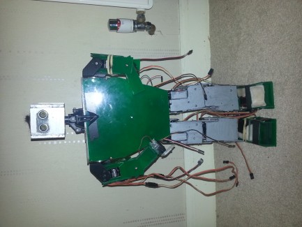 The servos are controlled by 2 Pololu servo controllers fixed to the Arduino I plan to get him to send all the input data he receives via Xbee to my laptop for more complex decision making which will then send commands sent back His waist in on an axis I plan to have it tilt from side to side with a servo to aid balance while walking His arms are no where near complete I am planning on giving him a selection of hands for different tasks including one to hold to pieces of mechano together while the other one bolts them in place, and perhaps one to hold a selection ukulele chord so he can play along with me<!--break-->