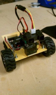 This was my first robot. It had been awhile since I did anything with electronics, so I had quite a bit of refreshers needed on soldering, etc... I modeled this robot after the "start here" model on LMR site with a few modifications. The first version I built had a 3xAA battery holder (the one that came with the Picaxe controller) but I wanted the ability to recharge the unit easily so I replaced it with a 5V charger battery from Radio Shack. The charger has a USB for charging the battery pack and an on/off switch so for less than $15 I was able to upgrade the robot to rechargeable status while adding an on/off switch. I'm using a micro servo that I got from a hobby store to turn the Sharp IR sensor. I chose the longer range IR sensor and it seems to be working well. I started with a pair of 32x7mm Pololu wheels but I have changed them out to the 42x19mm wheels/tires. I need to switch the motor mounts to the extended version in order for the motor shaft and the larger wheels to properly match up but they work ok for now with the standard mount. As a rear, third wheel I am using an adjustable, omni-directional ball caster with ball bearing. This works great on hard surfaces and even short carpet but tends to get caught on some rougher surfaces. Next I hope to mount a laser module to a secondary servo and write some code to menace the dog with the red dot. My next robot project is going to be a mounted airsoft gun with targeting capabilities.