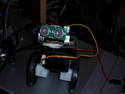 He is working as well as he could be. Still some minor bugs. If I hold him he doesn't stop until he gets close to something. On the ground he only moves a few inches then thinks he hit something. I think having the servo, motors, and board on the same power source is messing up the range finder. I'll get a video posted tonight.