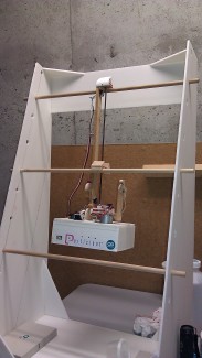 We created this robot to model what our full size robot will do at the FIRST Ultimate Ascent competition. There is a 30 point bonus for climbing the pyramid on the field and we decided that that was all we were going to do. As climbing 3 rungs is a somewhat perilous undertaking, we created this robot to help us work out the sequence of steps that need to happen. This is the "prettified" version that we are taking to the Colorado Regional (starts tomorrow, YAY!) that we will use to demonstrate what the full size robot is doing. While working out the programming this was actually controlled by a cRIO so this had a batch of wires hanging from it. We were able to do 95% of the programming that is being used on the full-size robot using this model. Basic functionality: - There is a "shuttle" that moves up and down via a lead screw. This is what lifts the robot. - The arm actually swivels on the body of the robot so that we can shift the CG of the robot and therefore guide the arm where we need it to go as the robot is climbing. - There is a latch at the bottom where the robot hangs while the shuttle is going back up to reach the next rung. - An optical encoder on the shuttle motor allows us to position the shuttle anywhere along its travel based on a count from the encoder. - Limit switches at the top and bottom let us know when the shuttle has reached its extents.